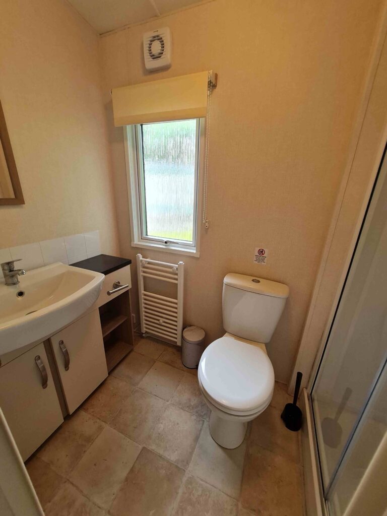 • Bathroom with large shower cubicle, basin and WC